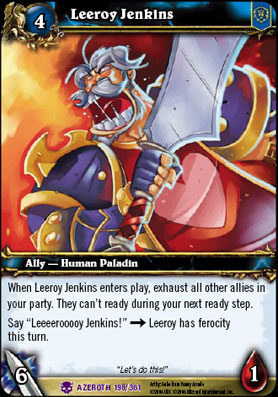 | Инфа по Лирою ( для тех , кто не знаком) Смеркалось. Группа рейдеров собралась зачистить один из участков подземелья в WoW. Рейд-лидер в голосовом чате нудным голосом рассказывал, как правильно вычищать большой зал от огнедышащих рептилий. Игрок Leeroy в это время отсутствовал (если быть точным, готовил курицу). Около середины лекции паладин вскочил, сказав «Ок, давайте сделаем это!» и с криком «LEEEEEEEEEEEEEEEEEEERRRRRRRRRROOOOOOOOOOOYYYYYYYY JENKIIIINS!!!!» вбежал в зал, сорвав на себя всю толпу драконов. Цимес состоял в том, что, сорвав ВСЕХ мобов в комнате, он кинул на себя мощное колдунство Divine Protection. К сведению: паладина оно делает невосприимчивым к атакам противника, а все окружающие монстры начинают воспринимать его как предмет обстановки. Естественно, что монстры тут же начали колошматить сопартийцев Лироя, сдуру забежавших за ним в зал. Под конец, когда ВСЯ группа пала смертью храбрых (ЧСХ, защищенный колдунством Лирой выжил), раздались негодующие крики лидера группы, на что доблестный паладин кратко ответил: «At least I have chicken». Сайт , посвященный Лирою http://www.leeroyjenkins.com/ Близзард создало отдельное достижение «Лиииииирой». В карточной вариации WoW появилась карта «Лирой Дженкинс». «Лирой Дженкинс» в качестве ответа на вопрос появился в американском шоу «Jeopardy» (изображение в прикрепленных)